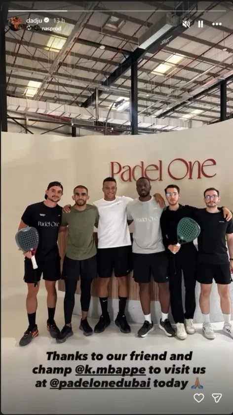 Singer Dadju posted an Instagram story showing Kylian Mbappé posing with members of the “Padel One” club, though without a racket. “Thank you to our friend and champion Kylian Mbappé for visiting us today,” the caption read.